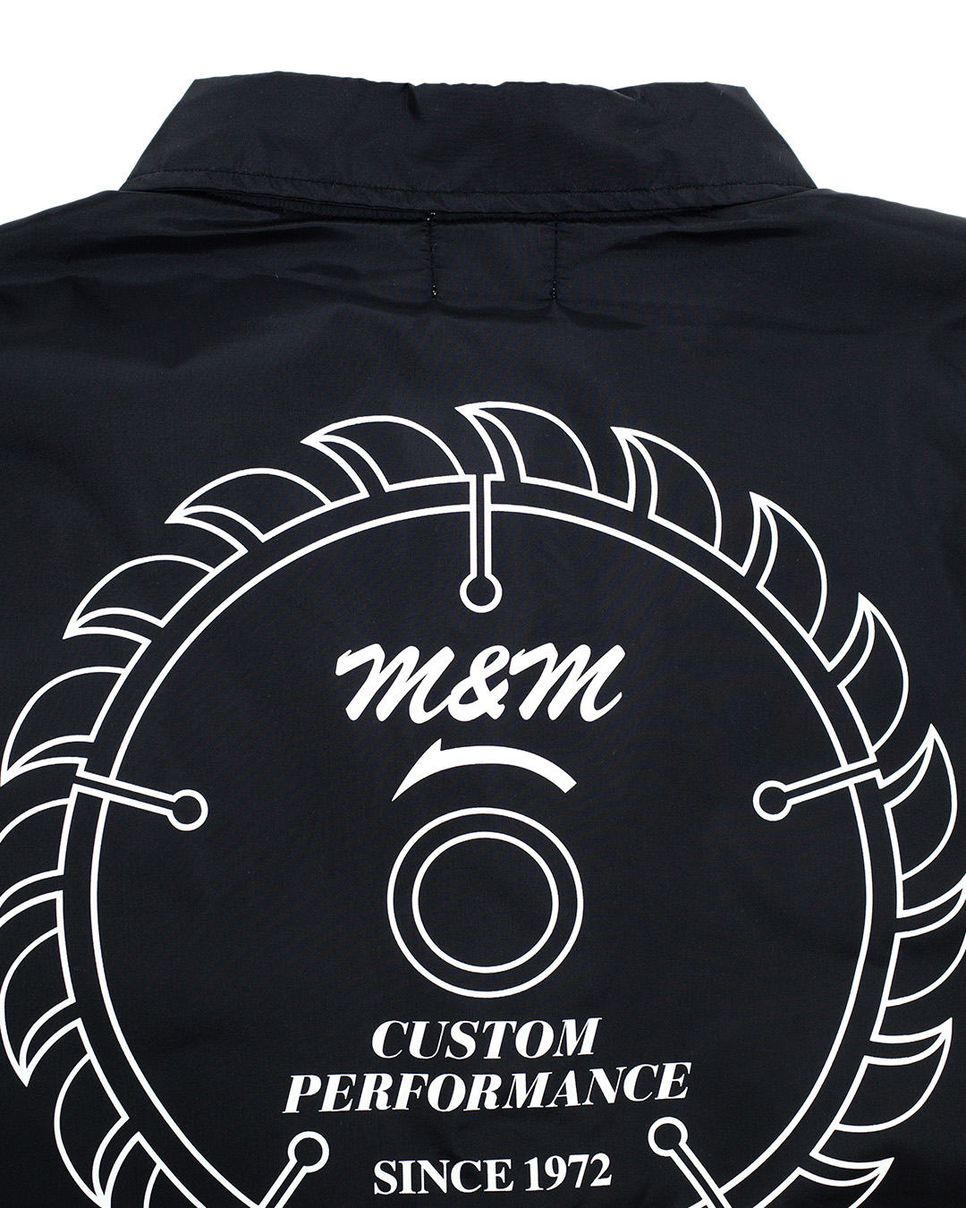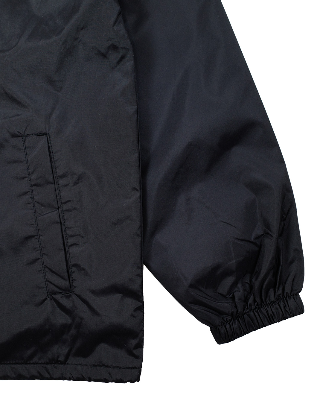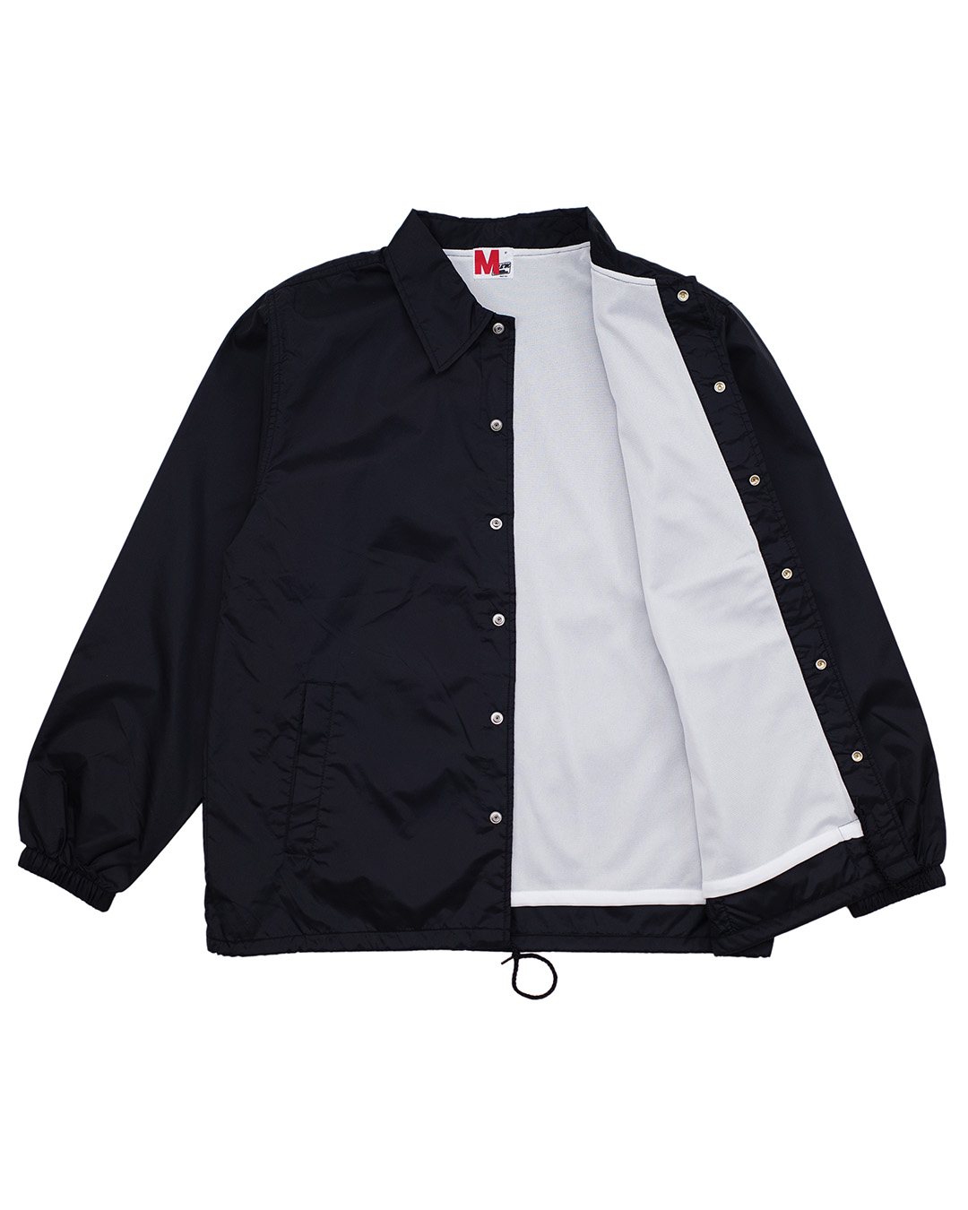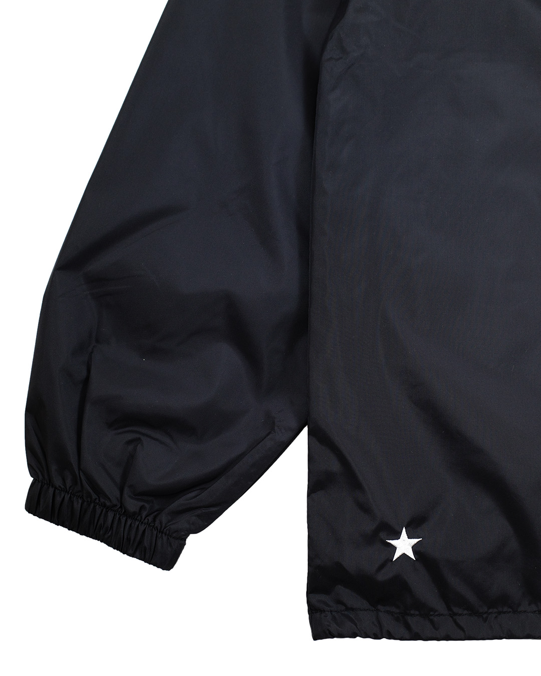ベーシックなスタイルのナイロンコーチジャケット。 胸、背中にプリント、バックの裾に刺繍入り。