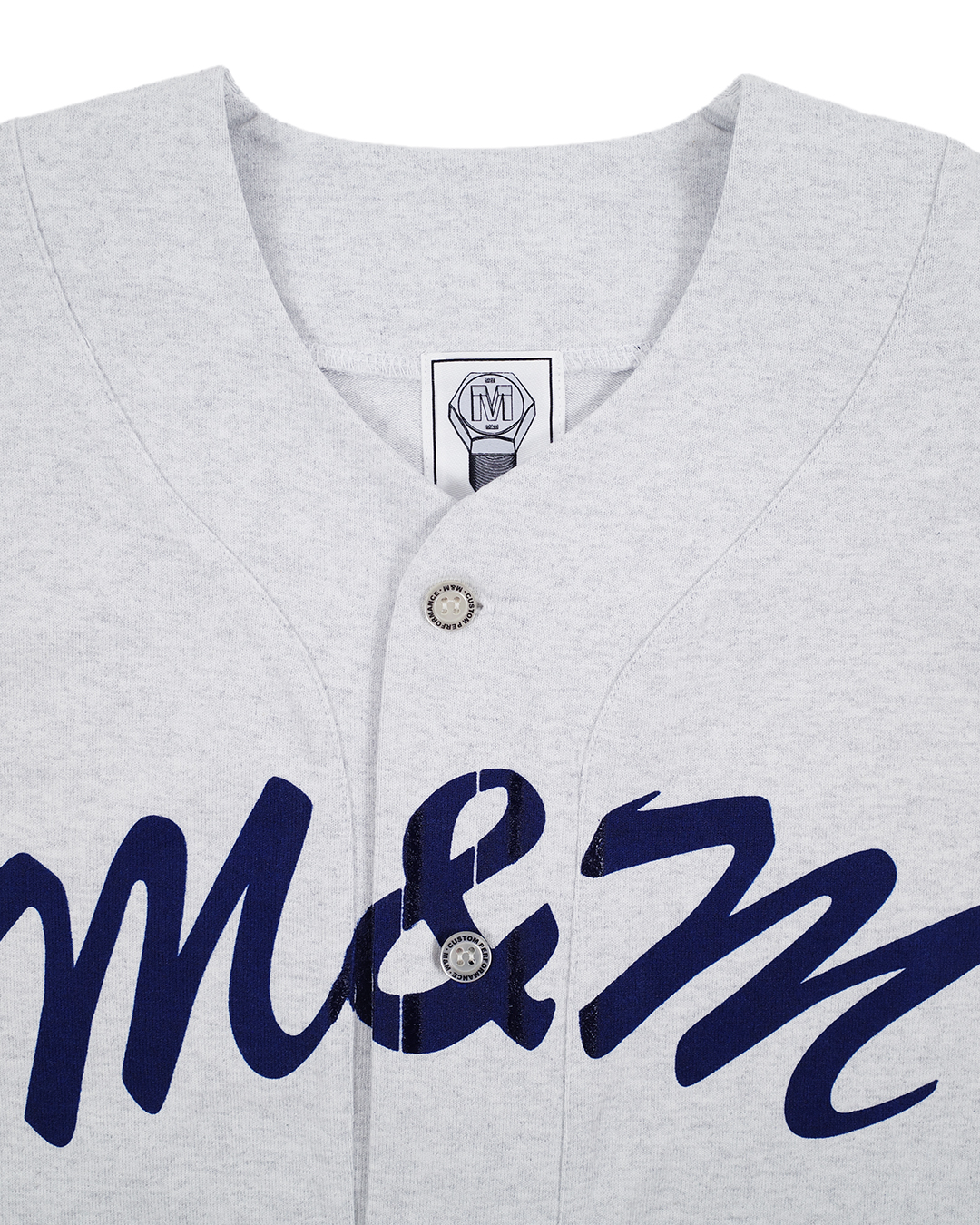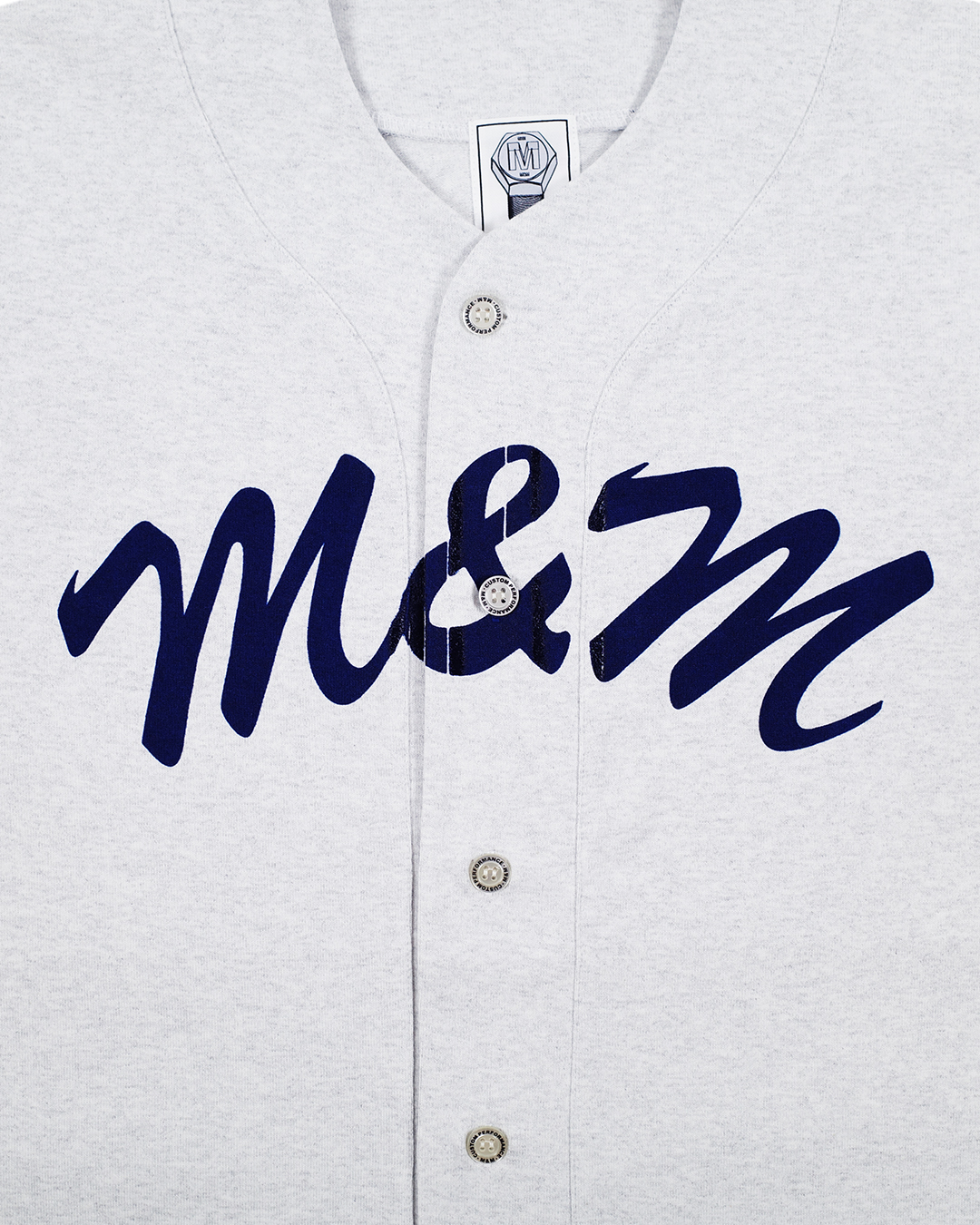 8.5オンスのヘヴィーウェイトコットンを使用したベースボールシャツ。 フロントと左袖にプリント、バック裾に刺繍。 M&Mオリジナルボタン。