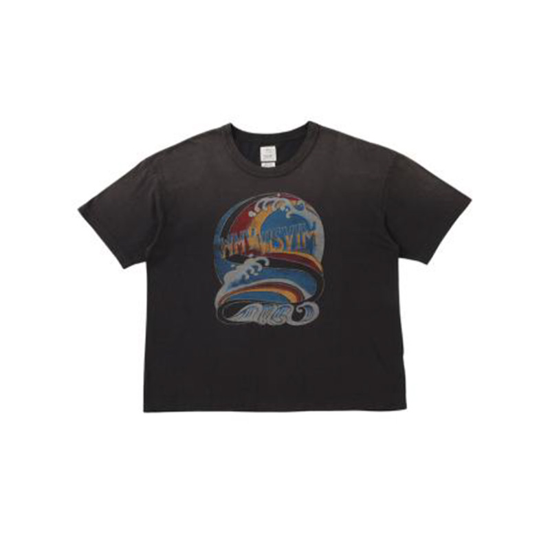 綿を使用した天竺製クルーネックショートスリーブTシャツ ジャンボシルエット ガーメントダイ ダメージ加工“WMV VISVIM”プリントディテール 100% 綿 FABRIC : 26 / 天竺(約5oz)表面の自然なムラ感とドライタッチで油が抜けたような風合いが特徴の生地。