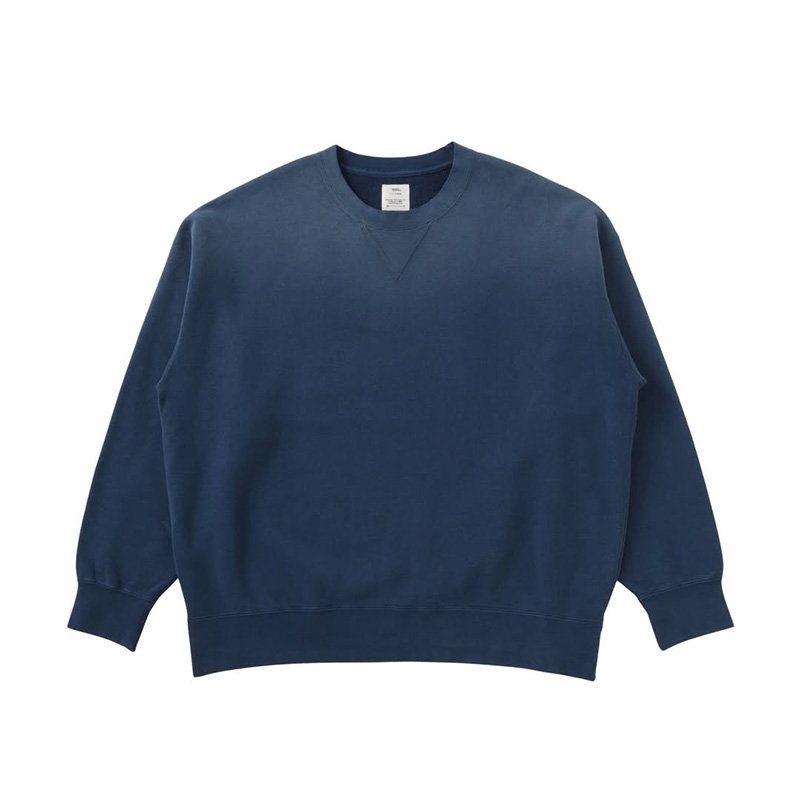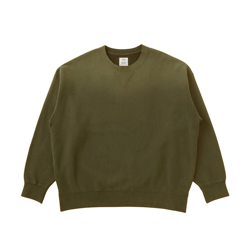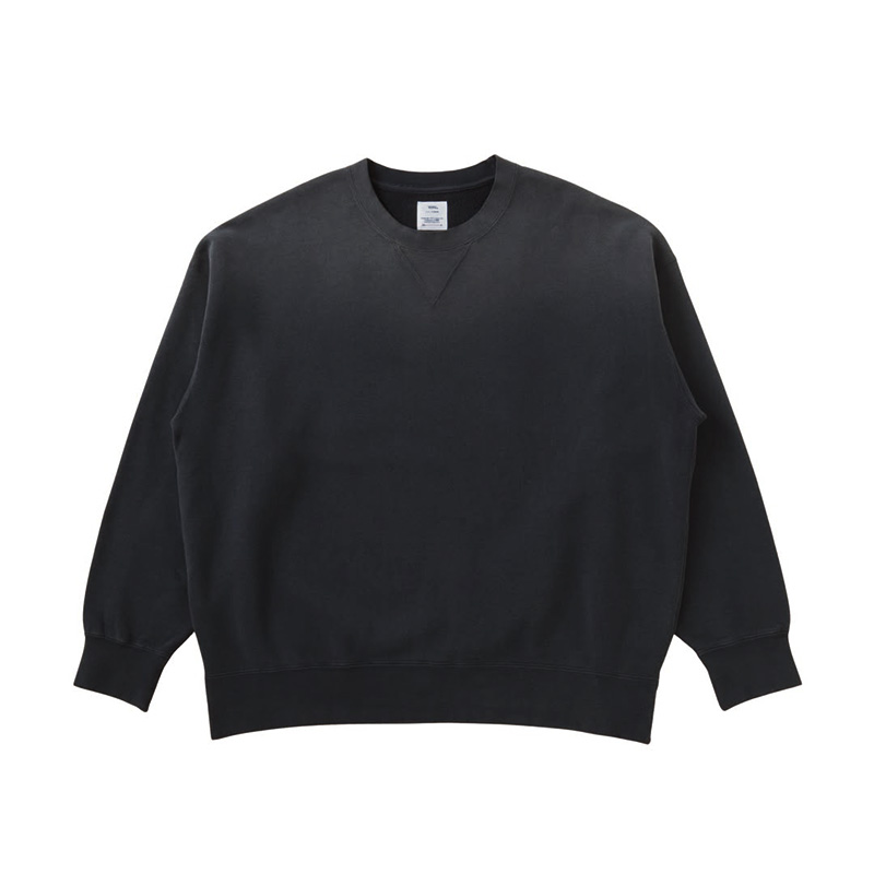 綿を使用した裏毛製クルーネックロングスリーブスウェットシャツ ドロップショルダーシルエット ガーメントダイ ダメージ加工 100% 綿 FABRIC : 26 / 裏毛(約10.5oz)表面の自然なムラ感とドライタッチで油が抜けたような風合いと、裏側の上質で滑らかな肌触りが特徴の生地です。