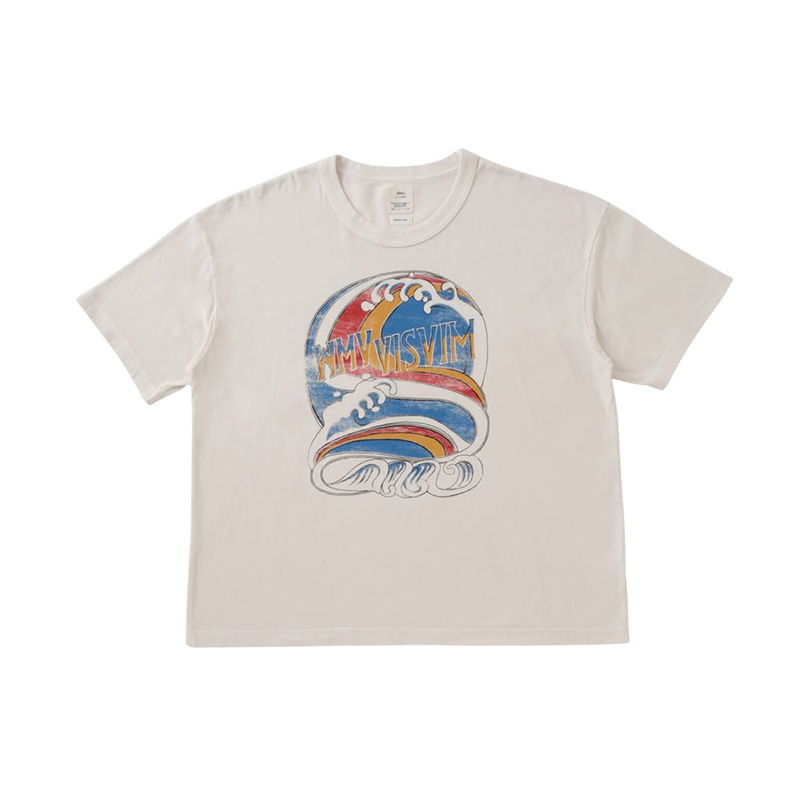 綿を使用した天竺製クルーネックショートスリーブTシャツ ジャンボシルエット ガーメントダイ ダメージ加工“WMV VISVIM”プリントディテール 100% 綿 FABRIC : 26 / 天竺(約5oz)表面の自然なムラ感とドライタッチで油が抜けたような風合いが特徴の生地。