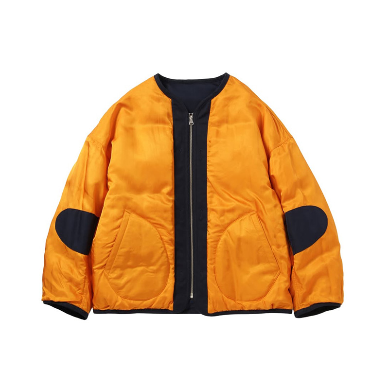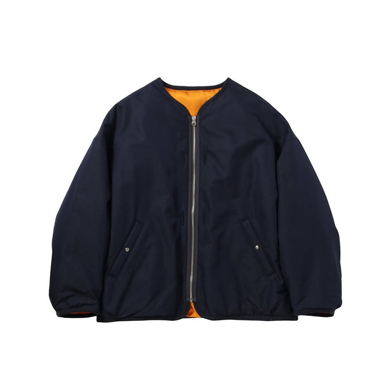 特殊な技術で紡績したウールとナイロンで織り上げた生地を使用したジャケット ホワイトグースのダウンを使用した詰め物 ワンウォッシュ オリジナル水牛ボタン リバーシブル仕様 60% 毛 40% ナイロン 特殊な技術でナイロンとウールを合わせて紡績した糸で織り上げた高密度タフタ。 ダウンウェア用生地の薄さとウールのナチュラルな表情を合わせ持った希少な生地。